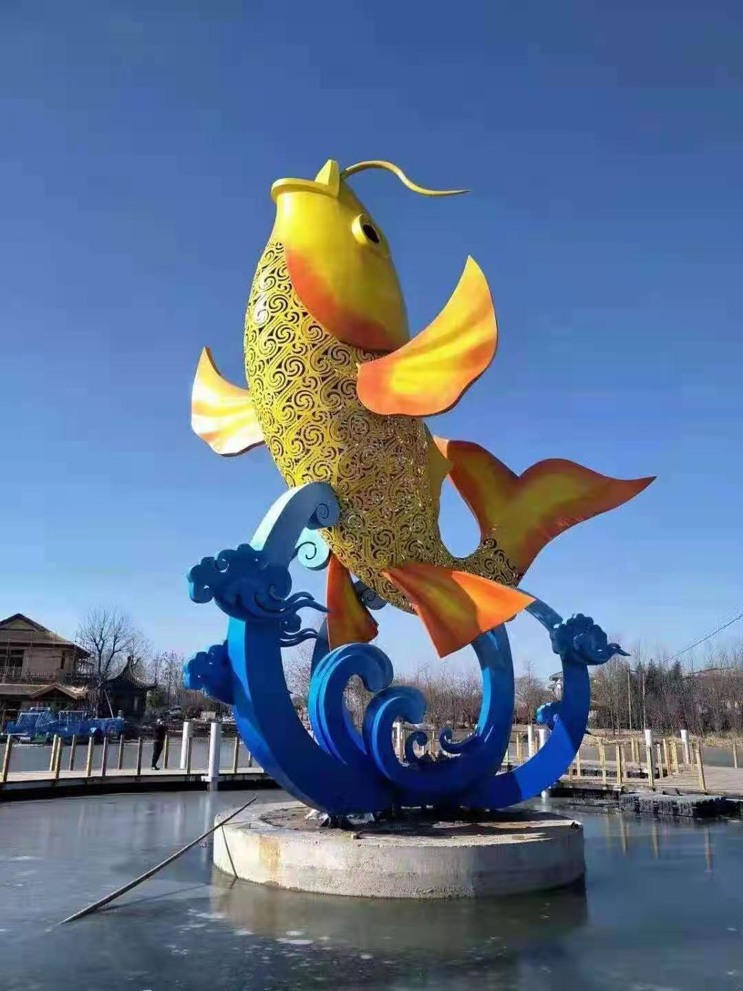 本雕塑采用不锈钢喷漆外观,鲤鱼跃龙门造型,形象逼真,大型户外雕塑景观,合适公园,景区,广场等大型室外场地,雕塑造型优美,大气形象,寿命长等!